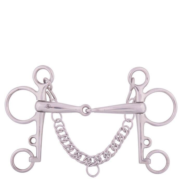 Einfach gebrochenes Mundstück, fester Edelstahl mit loser Schere, Länge der Schere 140 mm. Das Mundstück hat eine Dicke von 18 mm.