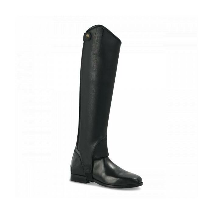 Fijne zijwaartse dressuurboog voor een optisch lang been. Buitenkant is slijtvast synthetisch leer met lederlook. Hoge elastische pasvorm en fleece voering voor een optimaal draagcomfort. Leren sluiting met trekkoord en messing drukknopen om de rits vast te zetten.
