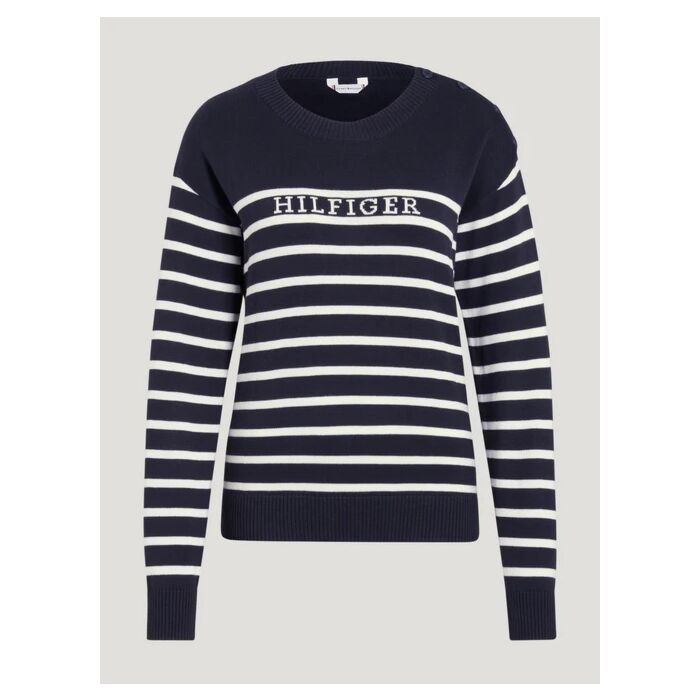 Der Pullover Tommy Hilfiger Fairfield Stripe in der Farbe Desert Sky in Größe L ist ein komfortabler und fein gestrickter Pullover mit klassischem Design und normaler Passform, erhältlich bei Equidrôme in Venlo und online.