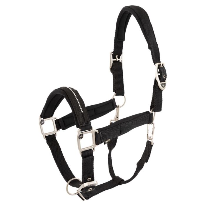 Komfortables und stabiles Halfter in Größe Cob mit weicher Neoprenpolsterung an Genickstück und Nasenriemen für hohen Tragekomfort und individuell verstellbarer Passform.