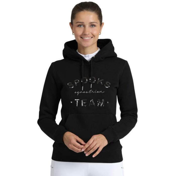 Der Spooks Tildah Hoody in Schwarz bringt Ihre Wintergarderobe mit seinem funkelnden Design auf die nächste Stufe. Dieser stylische Kapuzenpullover im taillierten Schnitt sorgt dafür, dass Sie bequem und modisch aussehen. Die glitzernden Pailletten, die das ikonische Spooks-Logo auf der Brust bilden, verleihen dem Design eine besonders glamouröse Note. Die weiche Kängurutasche bietet ausreichend Platz für Ihre wichtigsten Essentials, während die silbernen Stickdetails das moderne Design abrunden. Perfekt für Fahrer, die gerne mit einer Kombination aus Komfort und Flair auffallen. Der Spooks Tildah Hoody in Schwarz ist exklusiv bei Ruitersport Equidrôme erhältlich, Ihrem Spezialisten für Reitmode und Accessoires.