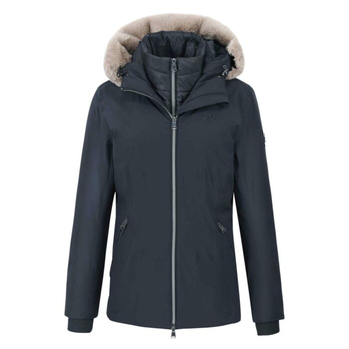Die Isa-Jacke von HV Polo aus der Winterkollektion vereint Eleganz mit ultimativem Schutz vor den Elementen. Diese mittelstark wattierte Jacke in klassischem Schwarz hat einen hohen Kragen und einen luxuriösen Pelzkragen um die Kapuze, der ebenfalls verstellbar ist. Die Innenjacke aus perlmuttartigem Stoff ist abnehmbar und bietet Ihnen Flexibilität bei unterschiedlichen Wetterbedingungen. Die vollständig versiegelten Nähte machen die Jacke wasserabweisend und winddicht, während der 2-Wege-Frontreißverschluss mit gebrandeten Reißverschlussschiebern für zusätzliche Funktionalität sorgt. Die Jacke ist vollständig mit einem Kontrastfutter gefüttert und hat auf der Innenseite ein glänzend aufgedrucktes Etikett aus Daunenimitat. Die Feinripp-Innenbündchen, der Kinnschutz und die Vordertaschen mit Reißverschluss bieten sowohl Komfort als auch Stil. Im Inneren befindet sich eine Reißverschlusstasche für zusätzlichen Stauraum. Das HV Polo-Logo in Metallic-Optik auf der Brust links und die Pferdeplakette aus Metall am Oberarm links verleihen dieser eleganten Jacke eine schicke Note. Schwarze Metallaccessoires runden den raffinierten Look der Isa-Jacke ab. Besuchen Sie unseren Shop im Ruitersport Equidrome, um die Isa-Jacke selbst zu erleben, oder bestellen Sie sie ganz einfach online!