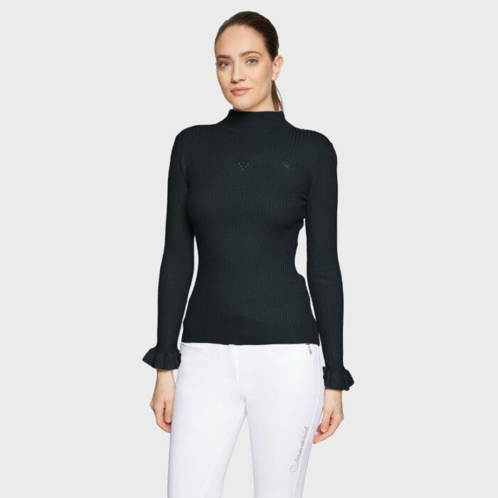 Der Samshield Lidia Ruffle Pullover in Moonless Night ist ein stilvoller Damenpullover mit Rüschen-Details und Swarovski® Kristallen. Das leichte aber wärmende Design mit hohem Kragen vereint Eleganz und Komfort ideal für Reiterinnen im Winter und im Alltag.
