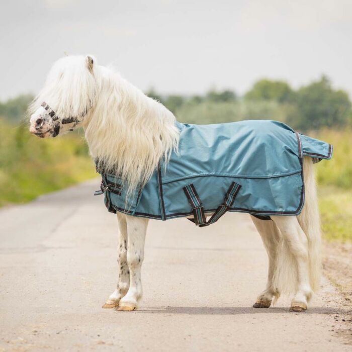 Die Decke besteht aus robustem 600D-Ripstop-Gewebe und ist absolut wasserdicht und atmungsaktiv, sodass Ihre Falabella vor den Elementen geschützt bleibt, ohne dass sie überhitzt. Das ungefütterte 0-Gramm-Futter macht die Decke perfekt für wärmeres Wetter. Durch die längere Vorderseite verhindert die Decke Öffnungen an der Brust, während der Nyloneinsatz das Scheuern minimiert. Der doppelte Schnellverschluss an der Brust, eine Kreuzbegurtung mit Gummizug, hohe Schlitze, elastische Beingurte und ein extra großer Schweiflatz sorgen dafür, dass sich Ihr Falabella frei bewegen kann, ohne dass die Decke verrutscht. Mit den D-Ringen lässt sich ein loser Hals einfach an der Decke befestigen, um zusätzlichen Schutz zu bieten. Der weiche Fleece-Einsatz am Widerrist sorgt für zusätzlichen Komfort, während die schwarzen Metallbeschläge für ein stilvolles und langlebiges Finish sorgen. Pflegeleicht: maschinenwaschbar bei 30 Grad. Für eine langanhaltende Qualität wird empfohlen, keinen Weichspüler zu verwenden, die Decke nicht im Wäschetrockner zu trocknen und eine chemische Reinigung zu vermeiden. Die Rain Rug QHP Turnout-Kollektion Falabella ist bei Ruitersport Equidrome erhältlich und bietet eine ideale Kombination aus Schutz, Passform und Stil für Ihre Falabella. Ein Must-Have für diesen Sommer!