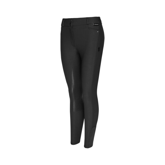 De Kingsland Kadi rijbroek met siliconen kniestukken is niet alleen ademend en rekbaar in vier richtingen, maar biedt ook een comfortabele pasvorm met een mid-rise tailleband. Het is water-, stof- en vetafstotend, waardoor het uiterst praktisch is en geschikt om er altijd schoon uit te zien in de stal of op de show. Deze rijbroek, die geschikt is voor dagelijks gebruik op stal, heeft een prachtige lurex bies op het zitvlak en een kleine, met kristallen versierde stud die een vleugje elegantie toevoegt.