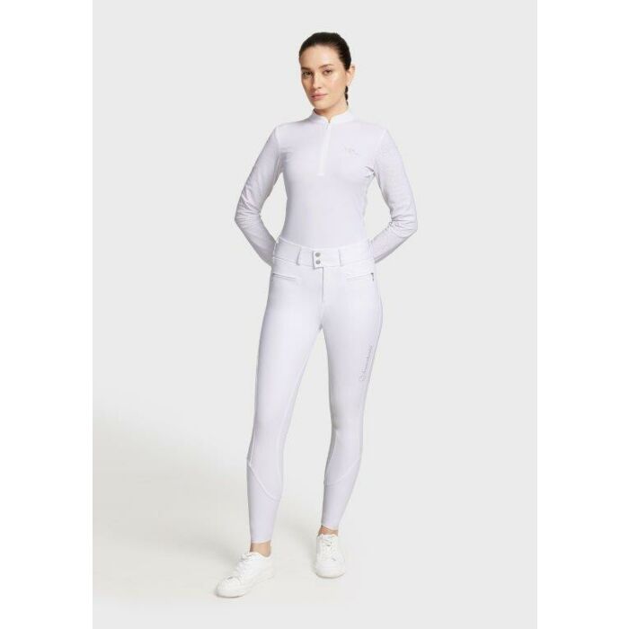 Die Claranova in Weiß ist eine Reithose mit ultrahohem Bund, stilvollem V-Schnitt und Faltendetail auf der Rückseite. Verziert mit Gürtelschlaufen und Taschendetails „Ultra Fine Rock“ von Swarovski, raffinierten Nähten und einem klassischen Kristalllogo verkörpern diese Reithosen mühelos raffiniertes Design. Hergestellt aus italienischem Vier-Wege-Stretch-Material, das dem Reiter ein zweites Hautgefühl mit völliger Bewegungsfreiheit und zusätzlichem sechslagigem Griff verleiht, der für absolute Stabilität im Sattel sorgt. Zu den weiteren Funktionen gehören eine Handytasche, Kompression an der Wade, die die Durchblutung erhöht, und ein elastisches Innenteil, das Ihr Hemd an Ort und Stelle hält.