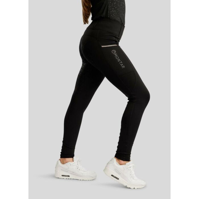 Reitleggings Montar MoLila Junior Black Größe 128 ist eine bequeme Junior Reitleggings mit Fullgrip die sicheren Halt im Sattel bietet und elegant mit Kristalldetails verziert ist.