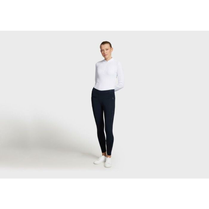 Die Alpha-Reithose verfügt über einen gekreuzten elastischen Riemen an der Vorderseite für eine moderne und außergewöhnlich schmeichelhafte Passform, die Komfort und Stil für Reiter neu definiert. Das Samshield-Logo ist auf dem Bügel wunderschön mit Swarovski-Kristallen verziert und sorgt für ein elegantes Finish. Sie bestehen aus EPD-zertifiziertem Stoff, sind außerdem umweltfreundlich und verfügen über eine temperaturregulierende Technologie, die Feuchtigkeit ableitet und Sie das ganze Jahr über trocken und komfortabel hält. Das italienische Vier-Wege-Stretchmaterial gibt dem Reiter ein Gefühl wie eine zweite Haut mit völliger Bewegungsfreiheit, während ein sechsschichtiger Griff für absolute Stabilität im Sattel sorgt. Zu den weiteren Merkmalen gehören eine Handytasche am Bein, ein komprimierender Wadenbereich für eine bessere Durchblutung und Muskelunterstützung sowie ein elastischer Einsatz an der Innenseite des Bunds, um Ihr Hemd an Ort und Stelle zu halten
