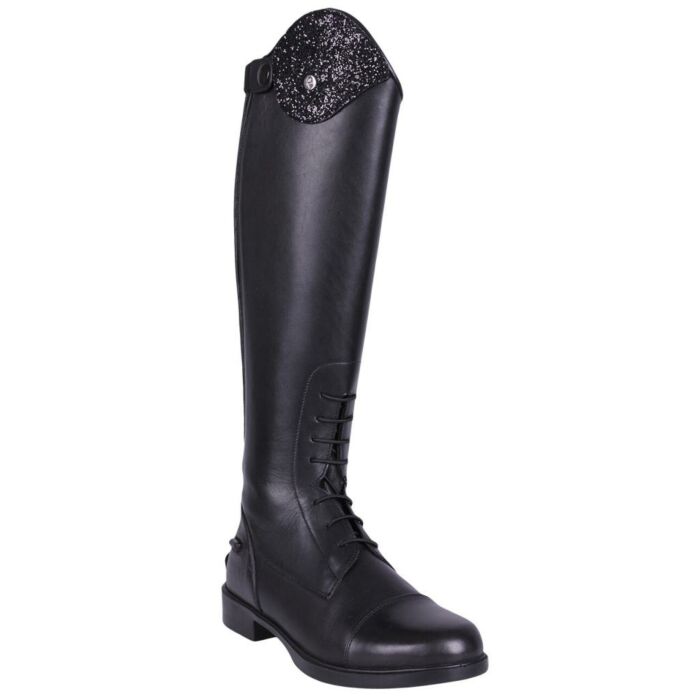 Reitstiefel Romy kommt Standard mit einem glitzernden Top. Die anderen Oberteile sind separat erhältlich. Der Schuh ist mit einem Reißverschluss mit einem elastischen Einsatz auf den hinteren und elastischen Schnürsenksen auf der Vorderseite ausgestattet.