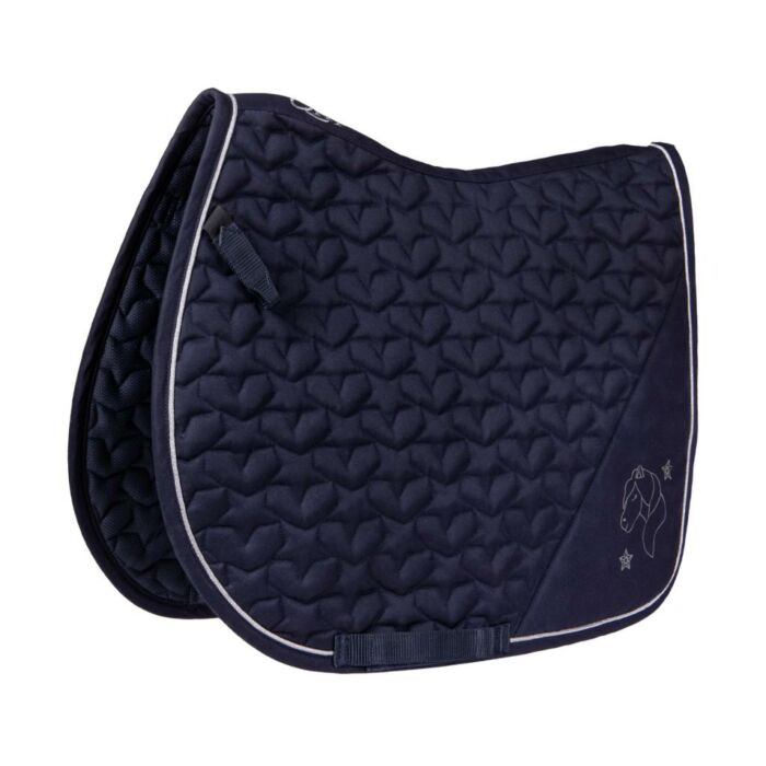 Satteldeck Gwenn in der Farbe dunkelblau mit süßem Druck wurde speziell für junge Fahrer und Amazonen entwickelt. Das Satteldeck verfügt über einen silbernen Druck, das absorbierende Netz und ist mit kurzen D-Ring-Loops mit Klettverschluss ausgestattet. Kurz gesagt: Ein Muss für Sie und Ihr Pony!