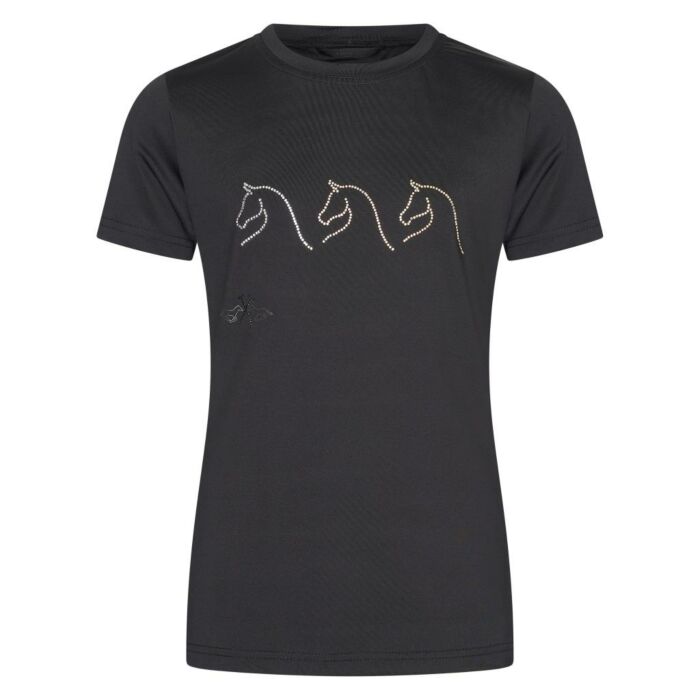 Auf der Vorderseite strahlen drei wunderschön gestaltete Pferde, die jeweils mit glitzernden Strasssteinen in verschiedenen Farben verziert sind. Dieses einzigartige und auffällige Design sorgt dafür, dass Sie immer im Rampenlicht stehen. Eine perfekte Wahl für jeden Anlass, vom Tagesausflug bis zum entspannten Nachmittag. Fügen Sie noch heute das HV Polo Wesla Shirt in Schwarz zu Ihrer Sammlung hinzu, erhältlich bei Ruitersport Equidrome!