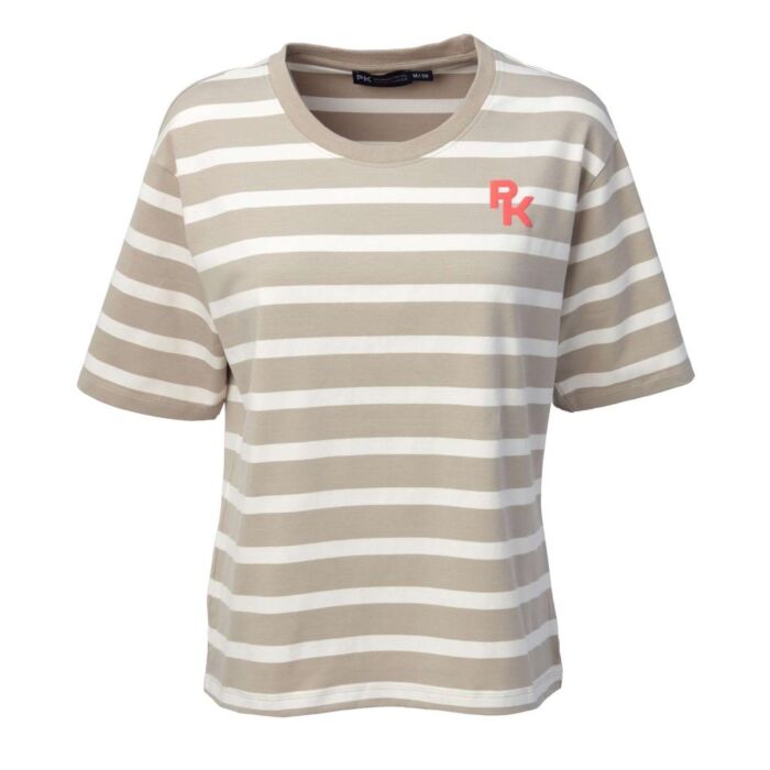 Das Shirt PK International Dalmore Feather in Größe L ist ein locker geschnittenes Baumwolle Elasthan T Shirt mit sportlichem Streifenmuster und auffälligem Detail.