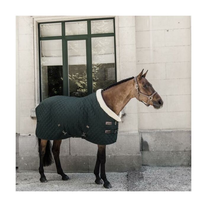 De Showdeken is gemaakt van 600D high tenacity polyester met een stijlvolle en tijdloze diamantvormige quilting. Hierdoor is het erg moeilijk het deken te scheuren en blijft er geen schaafsel aan het deken kleven. Om druk op de schouders en de schoft te verlichten, is de kraag van de showdeken gemaakt van onze populaire artificiële schapenvacht. Naast een chique uitstraling is de artificiële wol ook veel comfortabeler. Wanneer je paard bijvoorbeeld aan het eten is, zal de deken niet in de borst snijden.