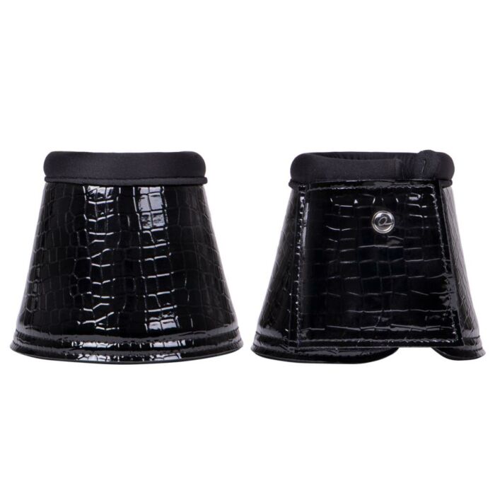 Diese Sprungschuhe in der Farbe Schwarz aus der Sommersammlung von QHP vervollständigen Ihr Djune -Set! Die springenden Schuhe fangen mögliche Schläge der Hinterbeine gut und schützen somit die Kronenkante und Hufbälle. Aufgrund des Lackleder-Krokoprintes und des schwarzen Q-Pins haben die Sprungschuhe einen stilvollen Look. Die Sprungschuhe können durch einen Doppelklettverschluss angebracht werden