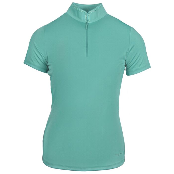 Das Trainingsshirt Harrys Horse Trendy Teal in Größe L ist ein weiches und elegantes T-Shirt mit kurzen Ärmeln, einem Stehkragen mit funkelnden Kristallen, einem kurzen Reißverschluss und einem dezenten EQS-Logo auf dem linken Ärmel. Erhältlich bei Equidrome in Venlo.