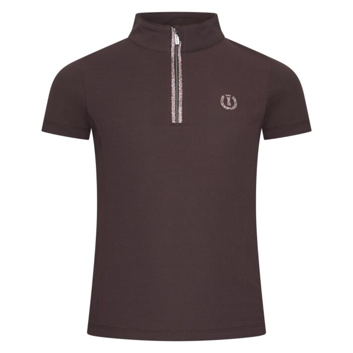 Bequemes und trendiges Trainingsshirt für junge Reiter von Imperial Riding in der Farbe Chocolate mit kurzen Ärmeln und halbem Reißverschluss, Größe 164, erhältlich bei Equidrôme in Venlo.