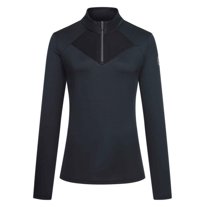 Gutes Trainingshemd mit langem Ärmel in der Farbe Schwarz. Das Hemd hat einen halben Reißverschluss und eine Netzwette. Das Hemd hat auch einen erhöhten Kragen und ein Steinkunstwerk links.