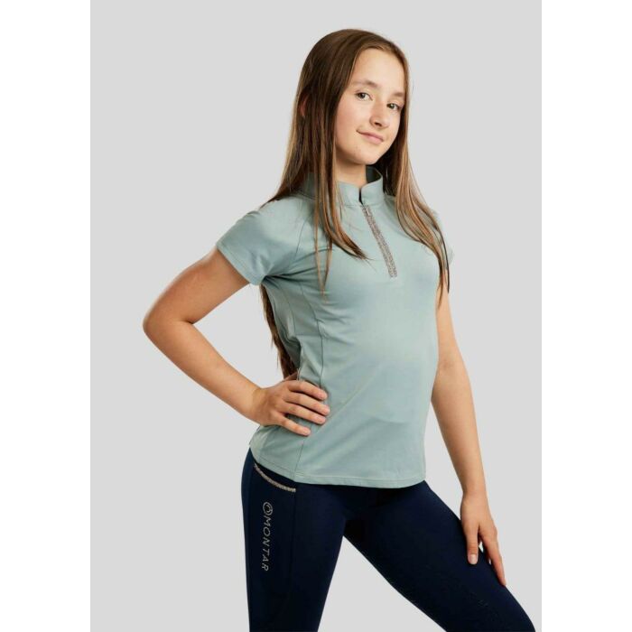 Trainingsshirt Montar MoLila Junior Turin Größe 128 wurde für junge Reiterinnen entwickelt die Komfort Bewegungsfreiheit und eine elegante Optik beim Training schätzen. Das leichte atmungsaktive Material fühlt sich angenehm auf der Haut an und bietet optimale Flexibilität beim Reiten und im Stall. Der kurze Reißverschluss ist mit champagnerfarbenen Kristallen verziert und verleiht dem Shirt eine hochwertige Ausstrahlung während das dezente Montar Logo den Look abrundet. Dieses Junior Trainingsshirt ist ideal für den Sommer und bei Equidrôme in Venlo erhältlich.