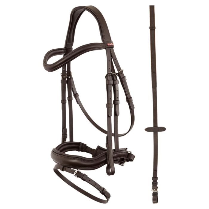 Hierdoor sluit het hoofdstel netjes aan op het paardenhoofd en zorgt het voor een goede drukverdeling. Het kopstuk, de gecombineerde neusriem en de brede kaakbeschermer zijn voorzien van een zachte voering voor optimaal comfort. Het gebogen frondeel en de rond gebombeerde neusriem hebben een rustige, effen uitstraling. Het hoofdstel wordt geleverd inclusief bijpassende antislipteugels.