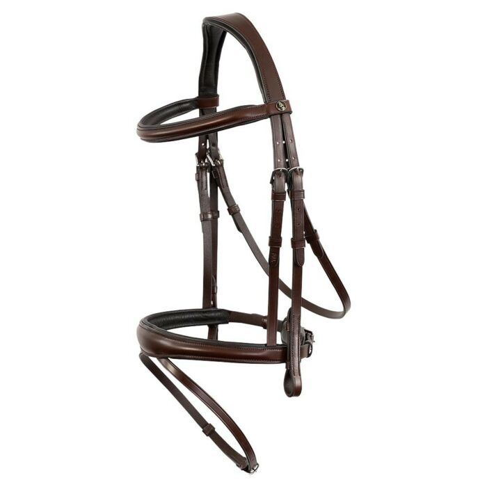 Sowohl das anatomisch geformte Genickstück als auch der Nasenriemen sind so konzipiert, dass sie den Druck optimal verteilen und eine perfekte Anpassung an den Pferdekopf gewährleisten. Dies erhöht den Komfort beim Fahren und verhindert unnötige Druckstellen. Ein besonders stilvolles Detail ist der integrierte Sperrriemen, der teilweise in der Vorderseite des Nasenriemens versteckt ist. Dies sorgt für einen eleganten, klassischen Look, ohne auf Funktionalität zu verzichten. Zusammen mit dem geraden Stirnband und dem weichen Backen- und Schnallenschutz ist dieser Zaum für Reiter und Pferd bis ins Detail durchdacht. Mit seiner warmen Eichenfarbe und den silberfarbenen Chrombeschlägen ist der BR Credition-Zaum in Eiche/Silber eine elegante Wahl für jeden Reiter, der Stil und Komfort schätzt. Erhältlich bei Ruitersport Equidrôme in Venlo.