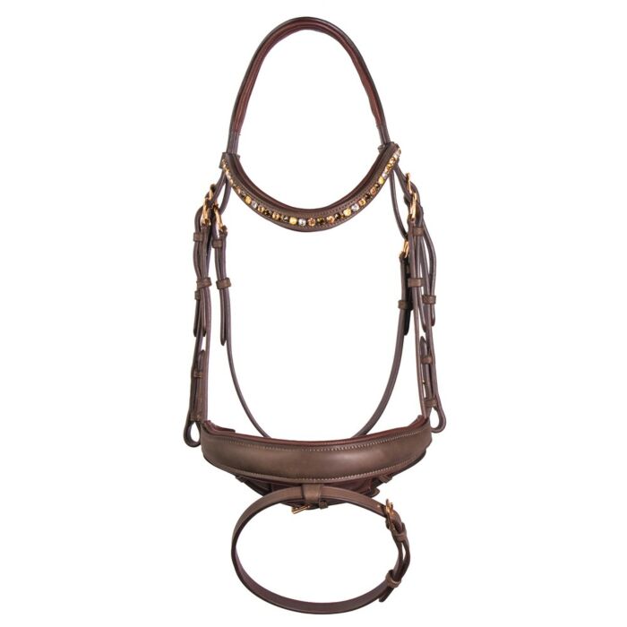 Das Harry’s Horse Trensenzaum Soft Bombastic Crystals in Braun ist ein komfortables Lederzaumzeug mit anatomisch geformtem Genickstück und Nasenriemen, verziert mit einer Kristallstirnriemen und roségoldenen Beschlägen.