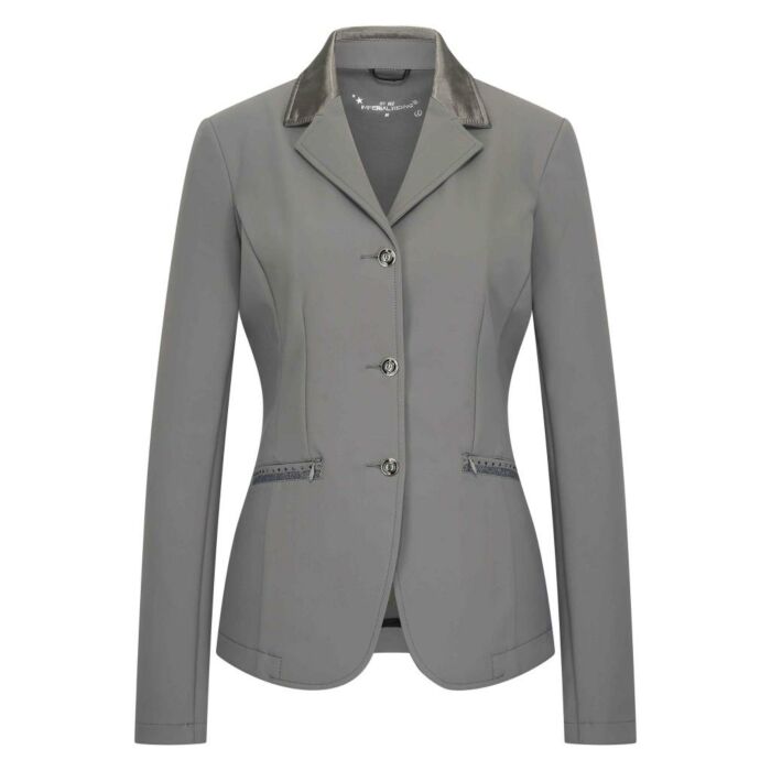Schöne Wettbewerbsjacke in der Farbe Grau mit überdachten CF -Reißverschlüssen und 3 sichtbaren Knöpfen. Die Jacke hat 2 ein paar Rohrtaschen mit Glitzerhahn und Strasssteinen mit blinden Reißverschluss.
