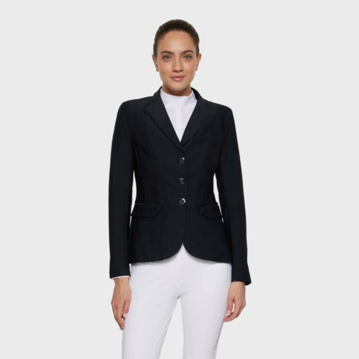 Die Samshield Victory Sculpt Wettkampfjacke in Schwarz vereint Innovation mit Eleganz und ist für Fahrer konzipiert, die sowohl Stil als auch Funktionalität verlangen. Der einzigartige Schnitt, bei dem die Vorderseite etwas kürzer ist als die Rückseite, sorgt für eine schmeichelnde Passform und zusätzlichen Komfort im Sattel. Dezente Details wie der Swarovski®-Wappeneinsatz und der versteckte Reißverschluss unter den Knöpfen verleihen dieser Jacke einen luxuriösen Look.